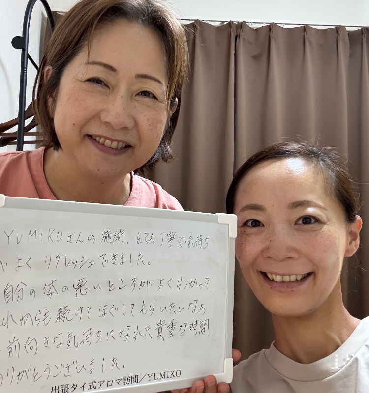 yumikoさんの施術とても丁寧で気持ちが良くリフレッシュできました。自分の体の悪い所がわかって、これからも続けてほぐしてもらいたいなぁと前向きな気持ちになれた貴重な時間ありがとうございました。