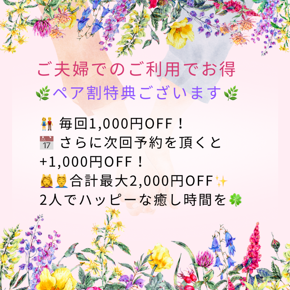 ✨ご予約感謝✨①次回割施術した翌日までに次回のご予約を入れて頂くと...🟠90.120分コース→2.000円引き🟠60分コース→1.000円引きお得に継続頂けます✨②次回割をご活用ではないお客様も施術から2ヶ月以内のご予約で10分サービス♪🌿月1回程の定期的なメンテナンスで、お身体が整いやすくなるのでおすすめしています✨